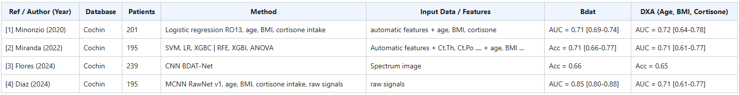 [2] Miranda D., Olivares R., Muñoz R., Minonzio J.-G. Improvement of Patient Classification Using Feature Selection Applied to Bidirectional Axial Transmission. IEEE Transactions on Ultrasonics, Ferroelectrics, and Frequency Control, 2022. DOI: 10.1109/TUFFC.2022.3195477