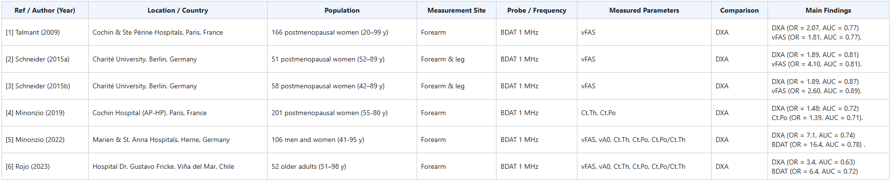 Ultrasonic devices present DXA alternatives, due to their portability, non ionizing properties and sensivity to mechanical properties. For instance the BDAT — Bi-Directional Axial Transmission device measures ultrasonic guided waves at the forearm or leg and estimate two key features: cortical thickness (Ct.Th) and cortical porosity (Ct.Po), both crucial indicators of bone strength.
