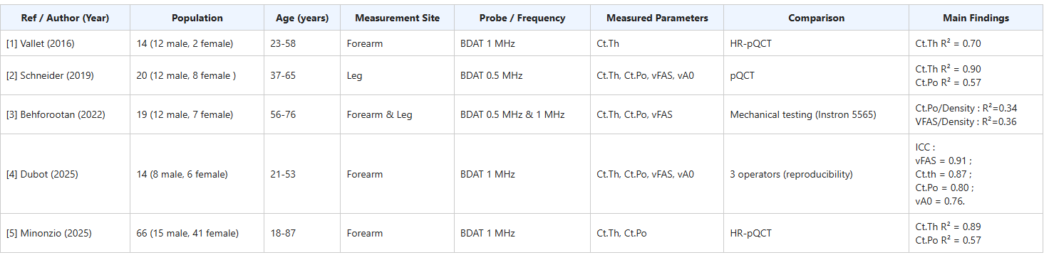 [5] Minonzio J.-G., Ramiandrisoa D., Fernandez S., Chappard C., Cohen-Solal M. Cortical bone parameters measured at the one-third distal radius using BDAT and HR-pQCT. Ultrasonics, 2025. DOI: 10.1016/j.ultras.2025.107829 — Data available at : https://osf.io/ehqrb